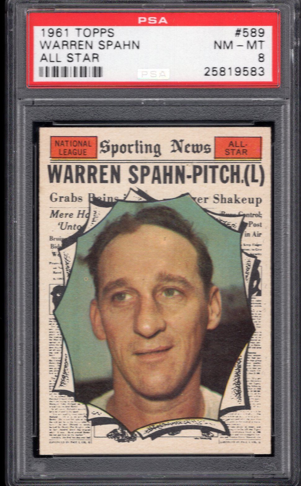 Title (ebay affiliate link): 1961 Topps #589 Warren Spahn AS PSA 8 NM-MT Braves