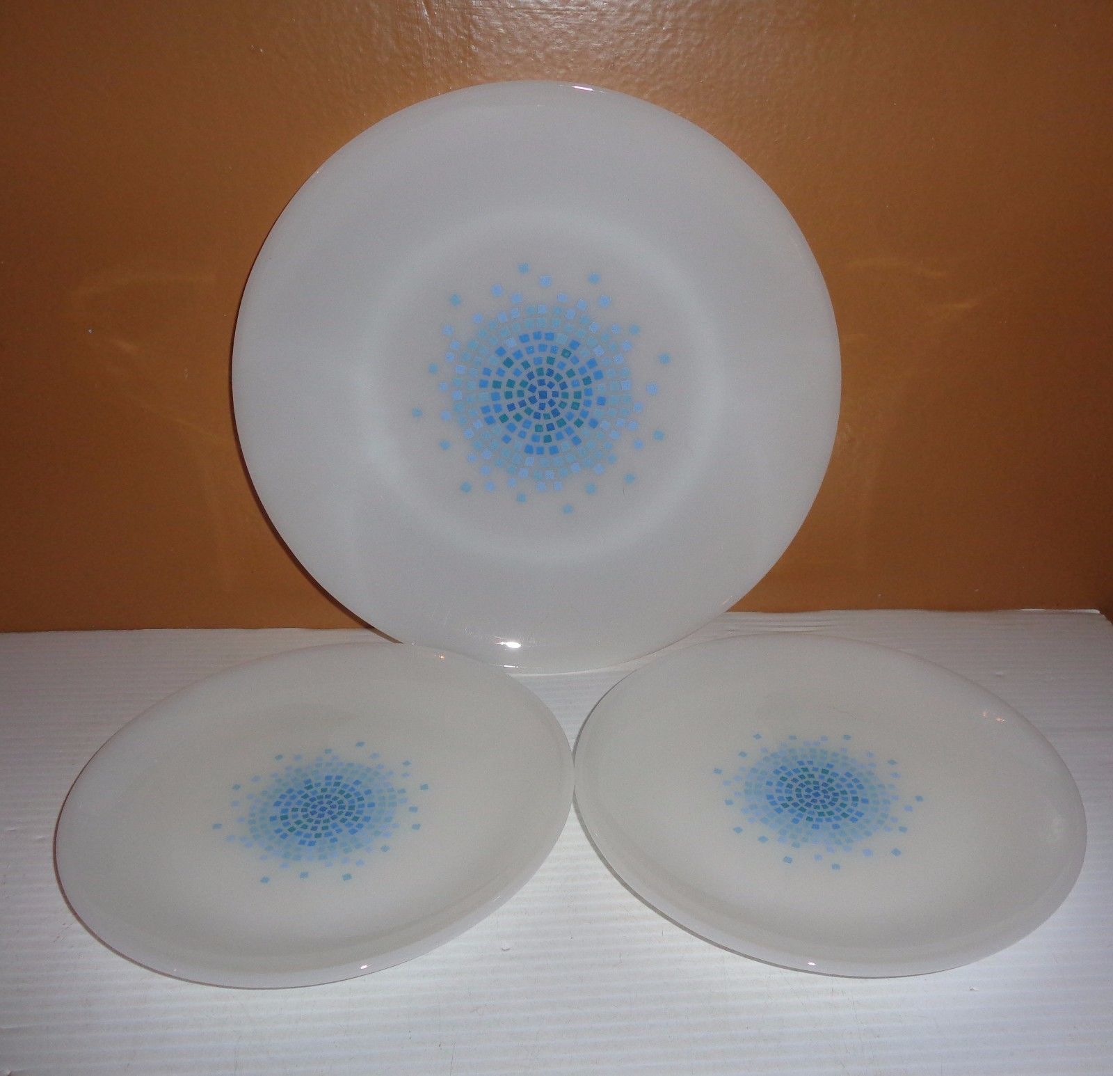 Fire King Blue Mosaic 1 Dinner & 2 Salad/Dessert Plates White Milk Glass