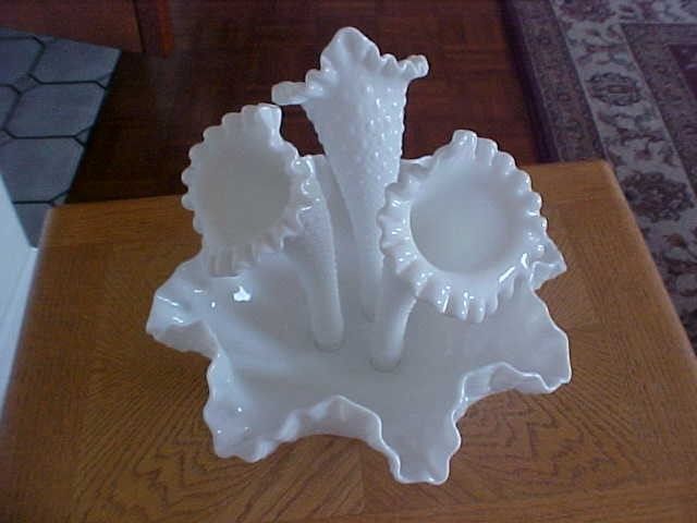 Large Vintage Fenton Art Milk Glass 3 Horn Diamond Lace Hobnail Epergne--Ex.
