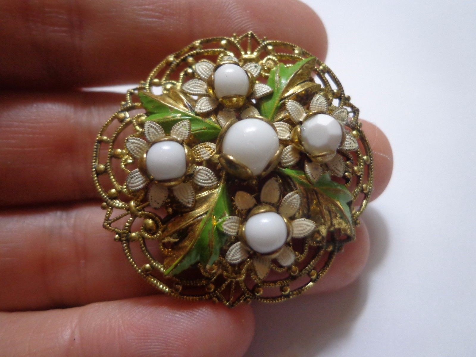 Title (ebay affiliate link): VINTAGE CZECH SIGNED MILK GLASS ENAMEL FLOWER BROOCH 1 3/4 IN