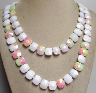 Vintage 50''s Long 50" Milk Glass AB Crystal Bead Necklace White