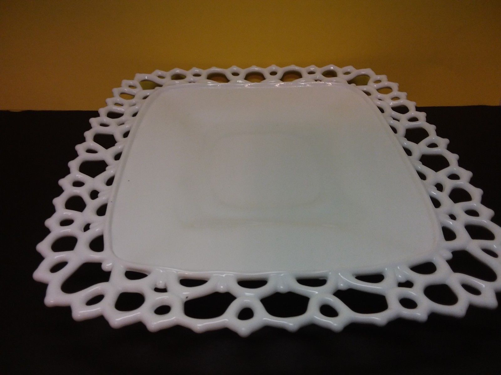 Title (ebay affiliate link): Vintage White Milk Glass RARE SQUARE Open Lace Edged Cake, Wedding Stand Platter