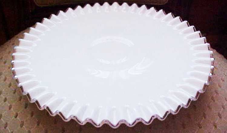 Title (ebay affiliate link): STAMPED FENTON WHITE MILK GLASS 12" LOW CAKE PLATE SILVER CREST PIE CRUST TRIM