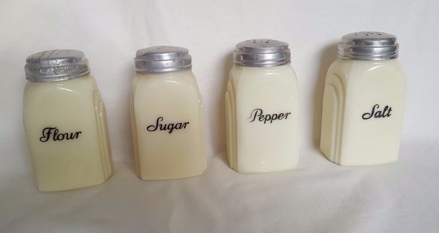 Title (ebay affiliate link): Vintage set of 4! Salt,Pepper,Flour,Sugar Shakers! Milk glass with aluminum lids