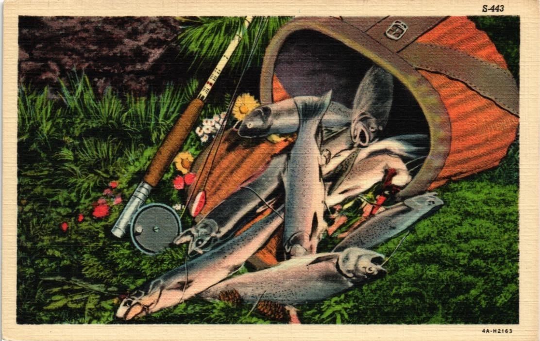 Title (ebay affiliate link): DR JIM STAMPS US LINEN POSTCARD CAUGHT FISH SPILLING OUT OF BASKET