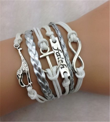 Title (ebay affiliate link): NEW Infinity giraffe anchor Antique Silver Leather Charm Bracelet HOT