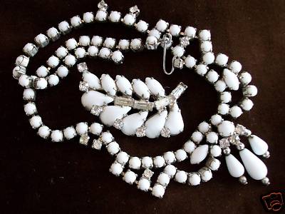 Vintage Milk Glass and Rhinestone Necklace and Pin Set