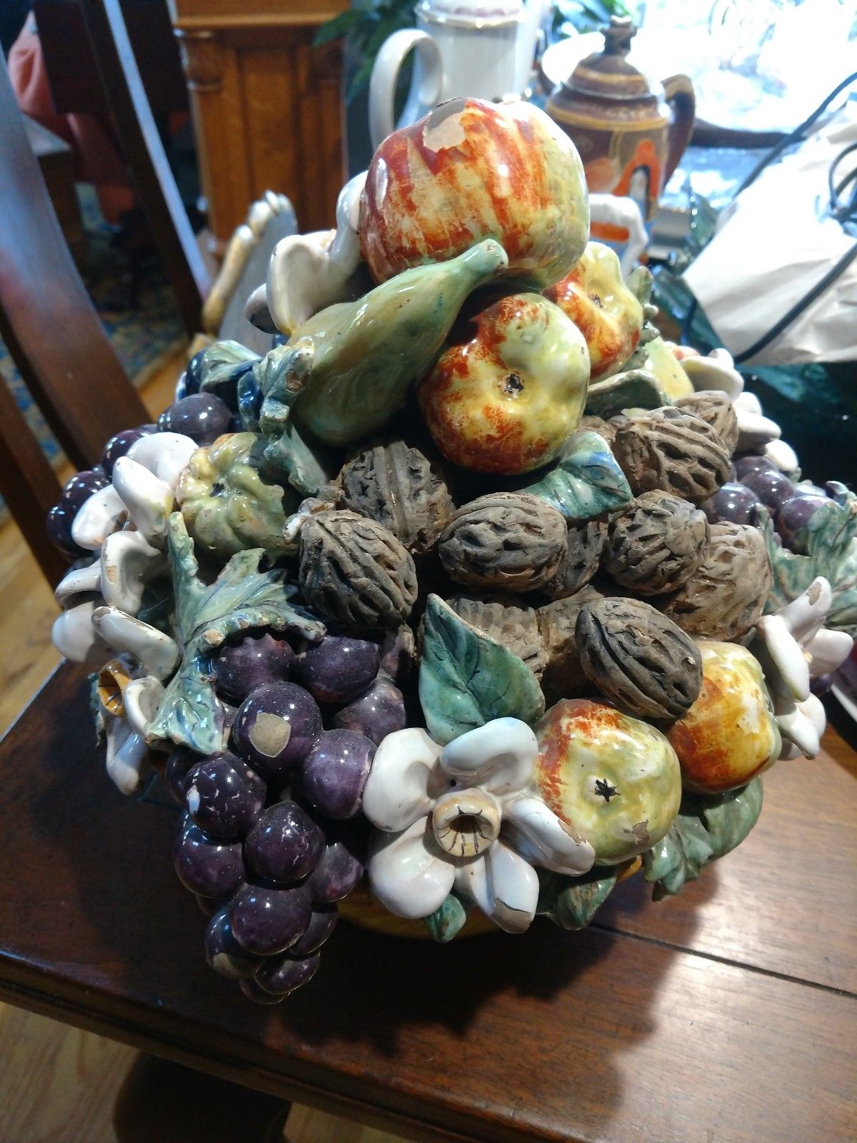 Title (ebay affiliate link): Capodimonte White and Yellow Basket of Fruit and Nuts, Banana, Flowers, Walnuts