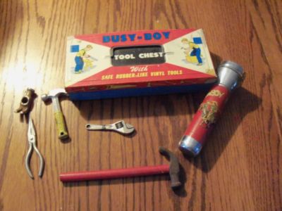 Vintage tin Busy boy Tool Chest Cowboy Flashlight tools