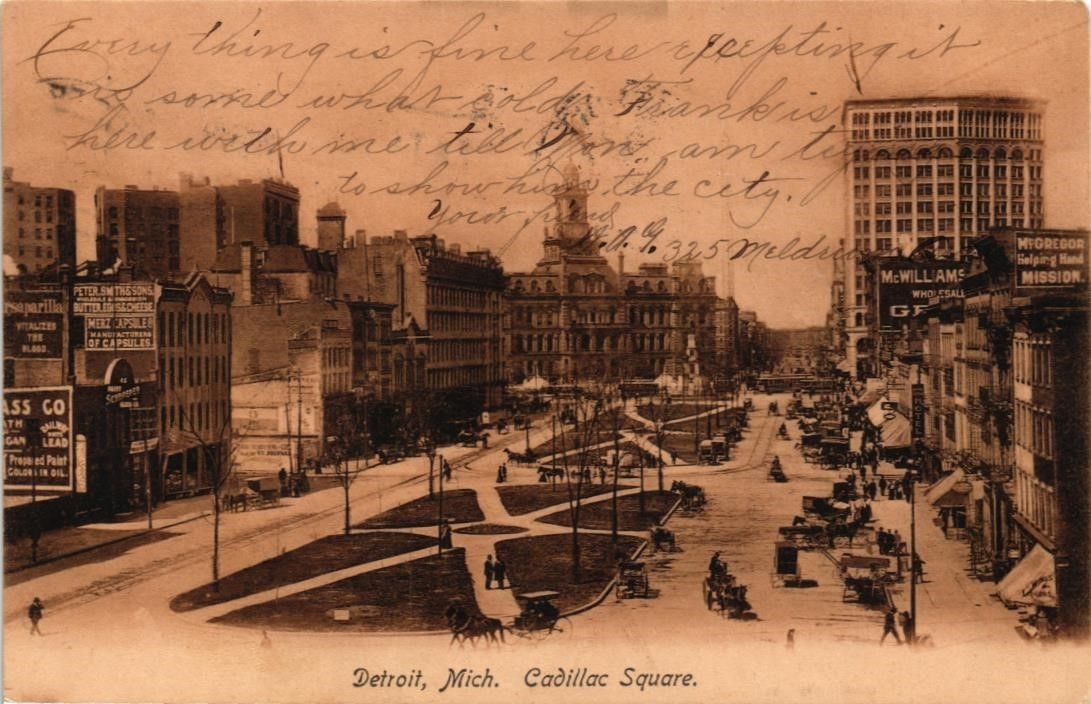 Title (ebay affiliate link): DR JIM STAMPS US VIEW OF CADILLAC SQUARE DETROIT MICHIGAN 1906 POSTCARD