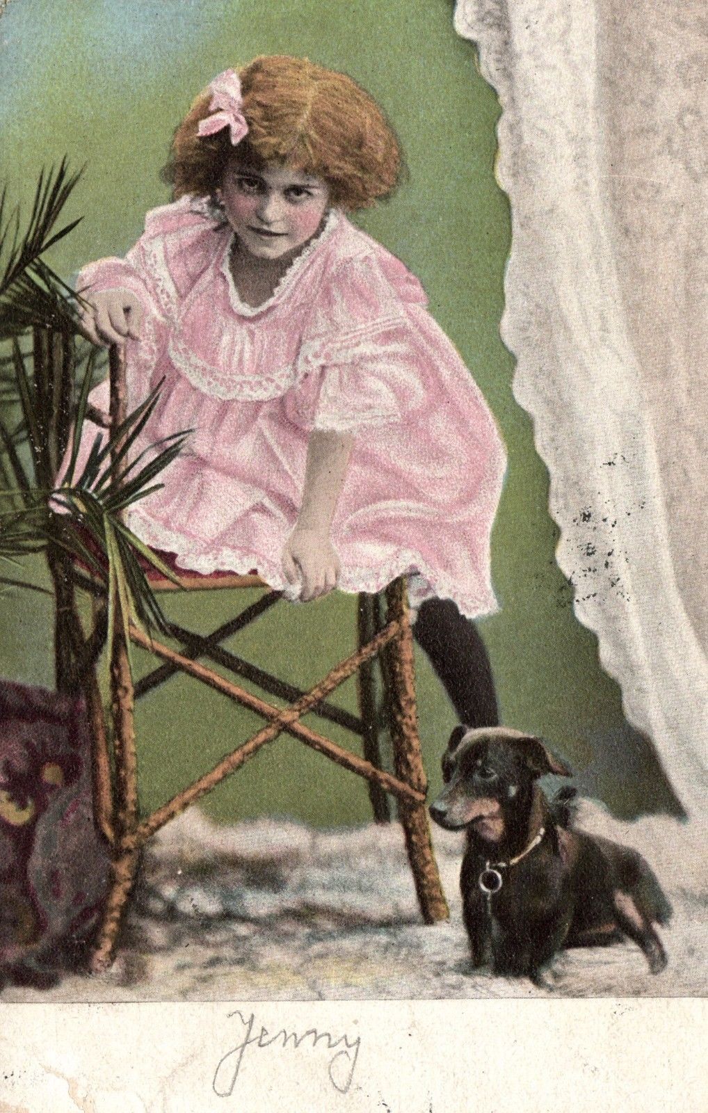 Dachshund Dackel dog with little girl postcard Ca 1907