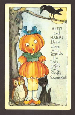 Halloween, Girl with Pumpkin Head, Crow, Owl, Black Cat Postcard, Carte Postale,