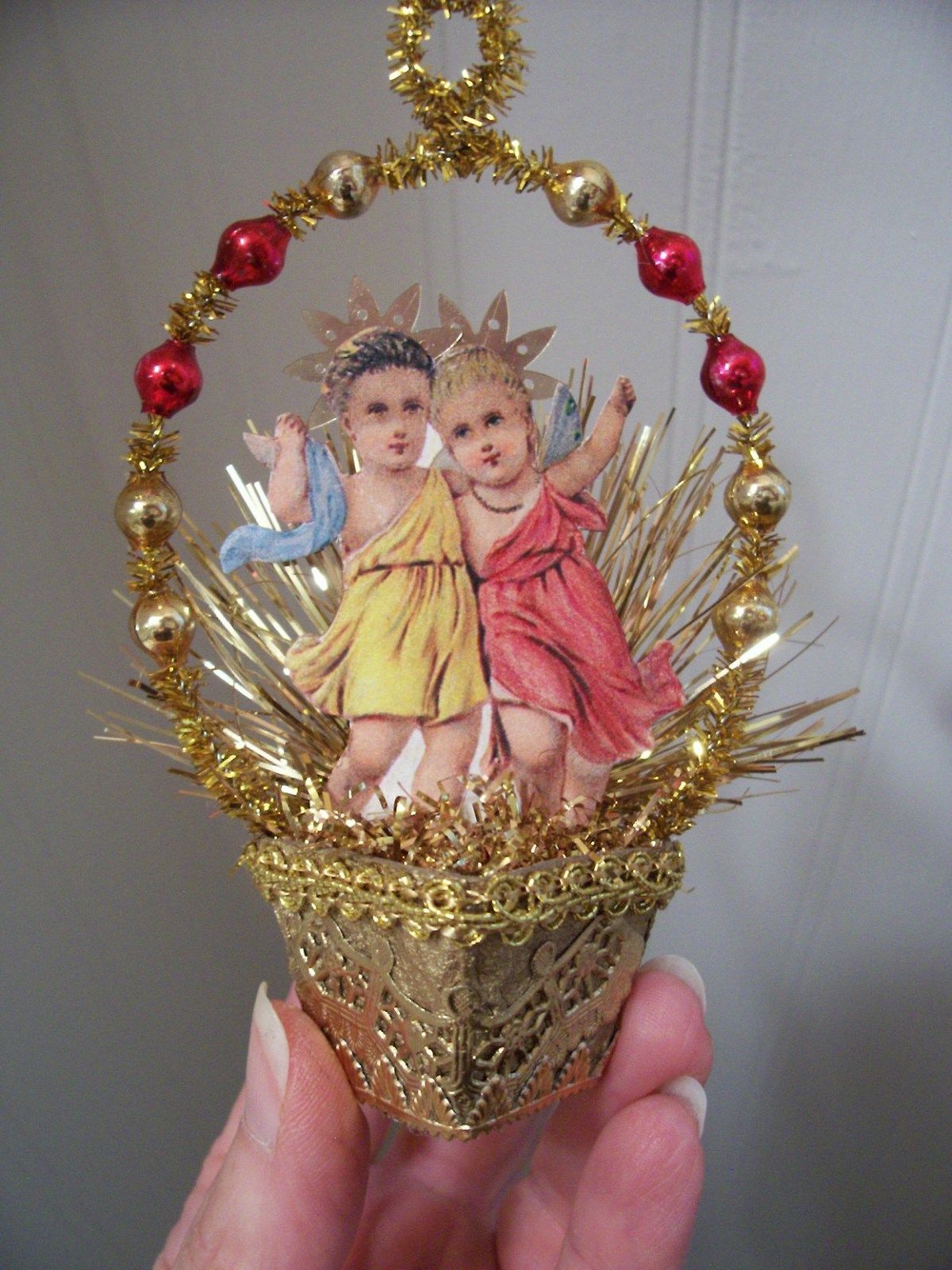 Antique Look Christmas Ornament, ANGELS/Red/Gold,Scrap,Tinsel,Glass, Handmade