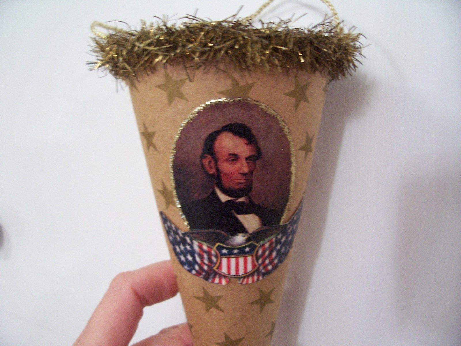 Antique/Vtg.Look Christmas Ornament, Cone, ABE LINCOLN, Scrap,Tinsel, Handmade