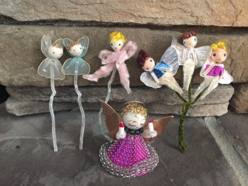 Title (ebay affiliate link): 7 Vtg Spun Cotton Chenille Aluminum ANGEL Christmas Ornaments Picks Ties Japan
