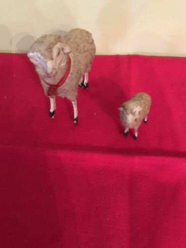 2 Antique Wool Sheep with wood stick legs
