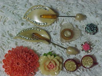 9 Antique CELLULOID Jewelry Hat Sweater Pins Brooches Clock Calla Lily Coral NR