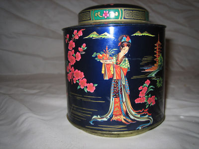 DANER English TEA TIN Caddy GEISHA GIRLS PAGODAS Cobalt