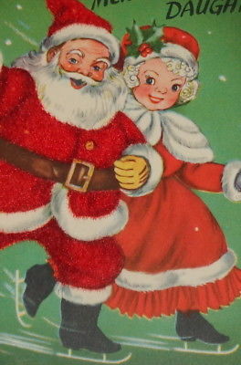 Vintage 1951 Christmas card, paper dolls, Santa & Mrs ice skating, 5 1/4" used