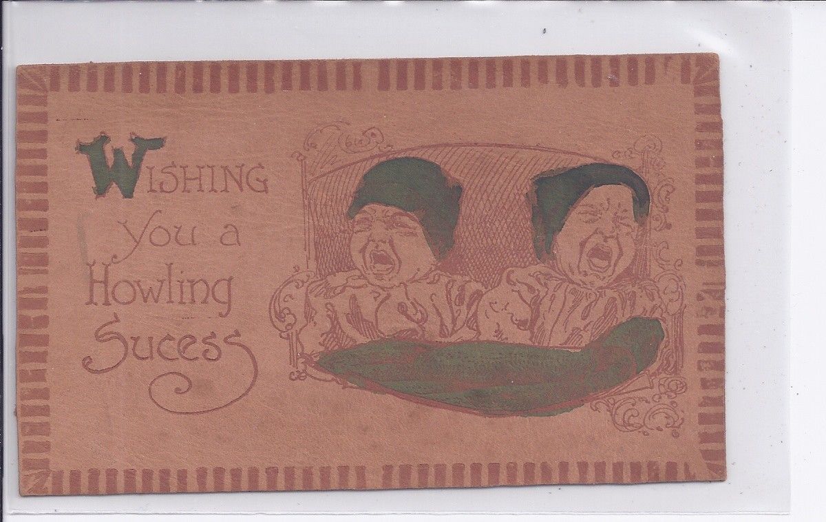 Title (ebay affiliate link): LEATHER, "WISHING YOU A HOWLING SUCESS"BABIES VINTAGE POSTCARD