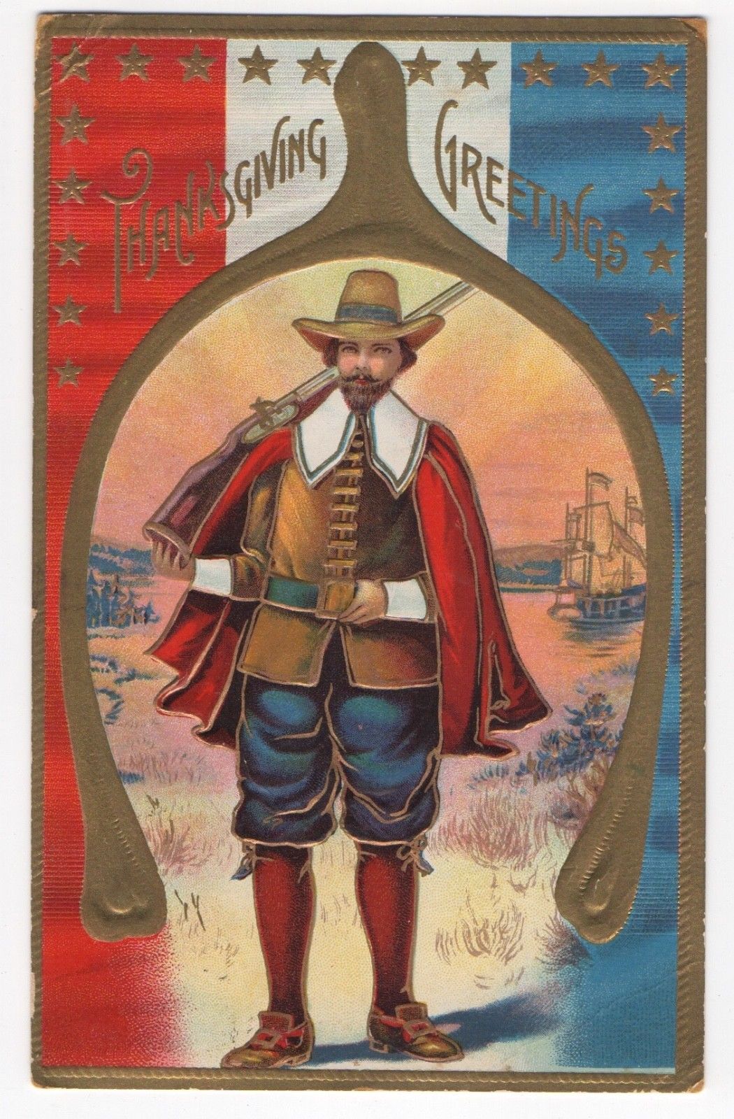 1909~PATRIOTIC RIFLE PILGRIM Thanksgiving Day WISHBONE Embossed Port Gibson,NY
