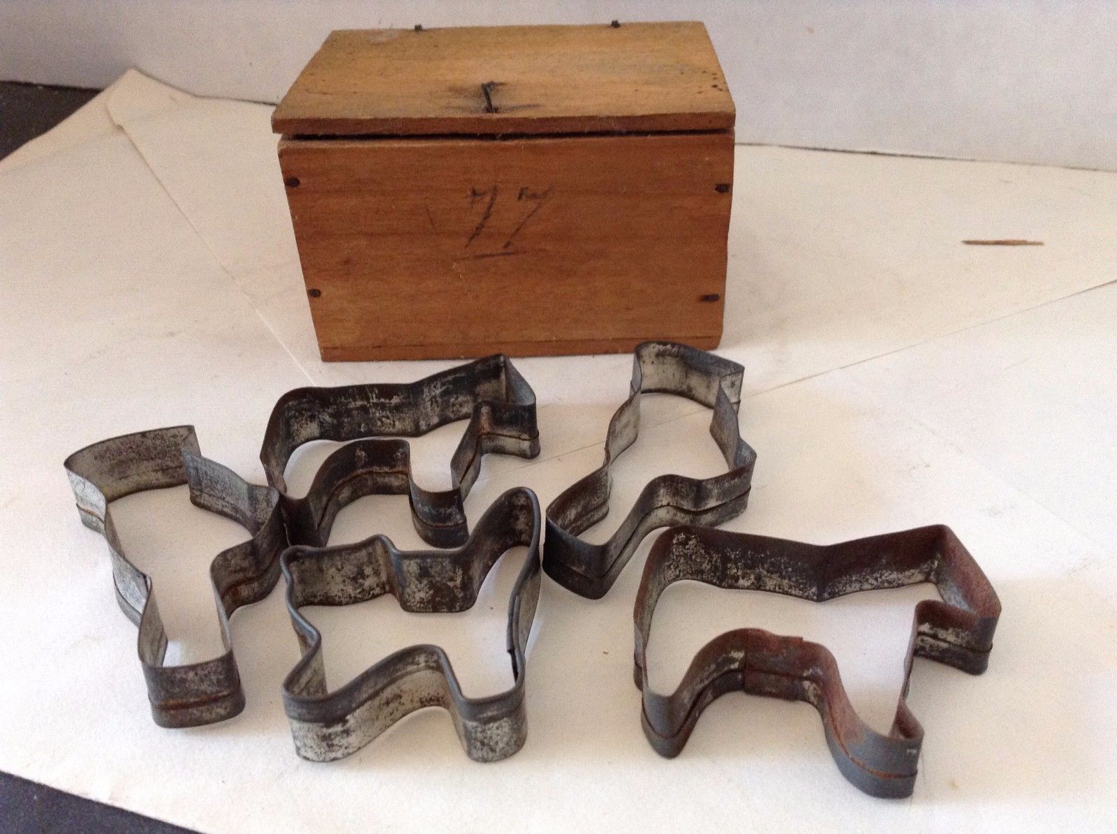 Title (ebay affiliate link): Vtg Primitive Small Wood Box w/ 5 Child''s Tin Cookie Cutters Cat Bird Horse