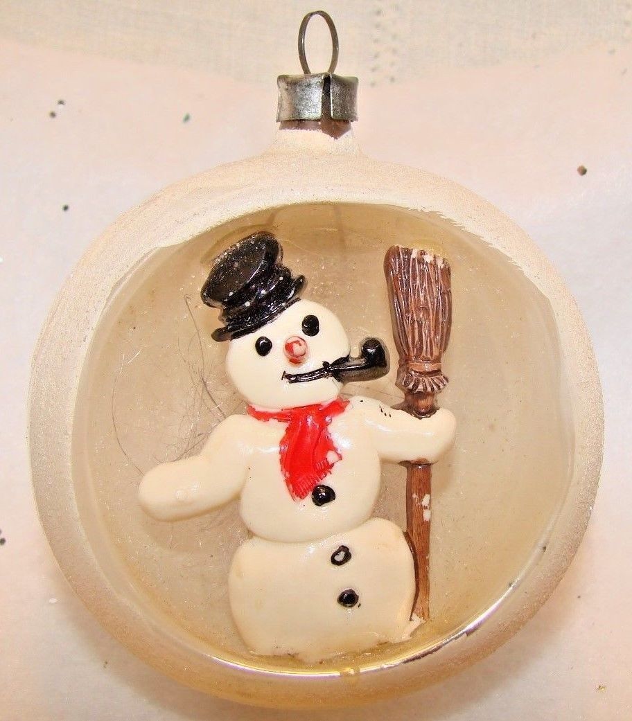 VINTAGE GERMAN DIORAMA INDENT CHRISTMAS ORNAMENT MICA SNOW SNOWMAN
