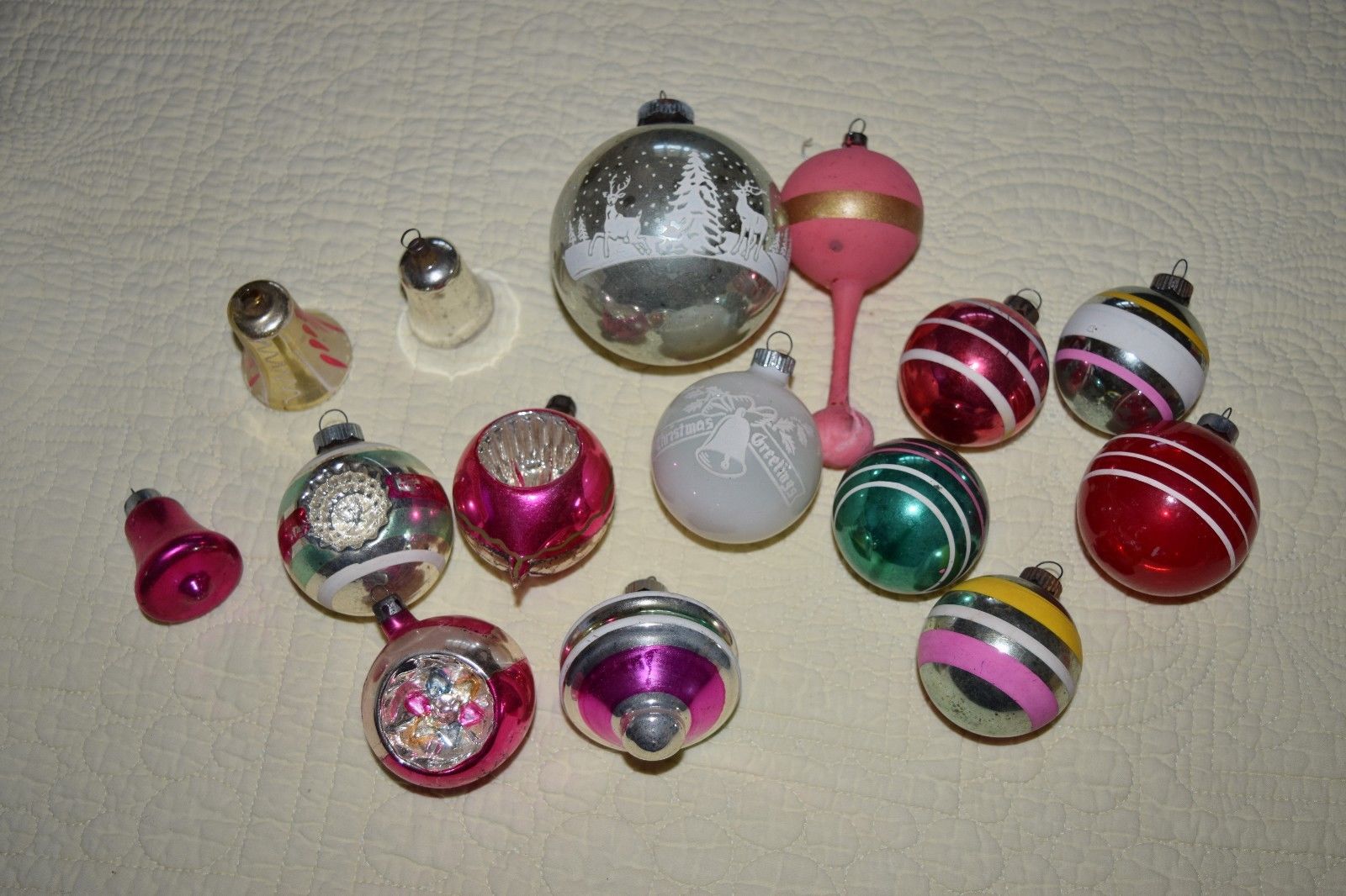 VINTAGE Glass CHRISTMAS TREE ORNAMENTS Indents Stripes UFO Bells Shiny Brite Box