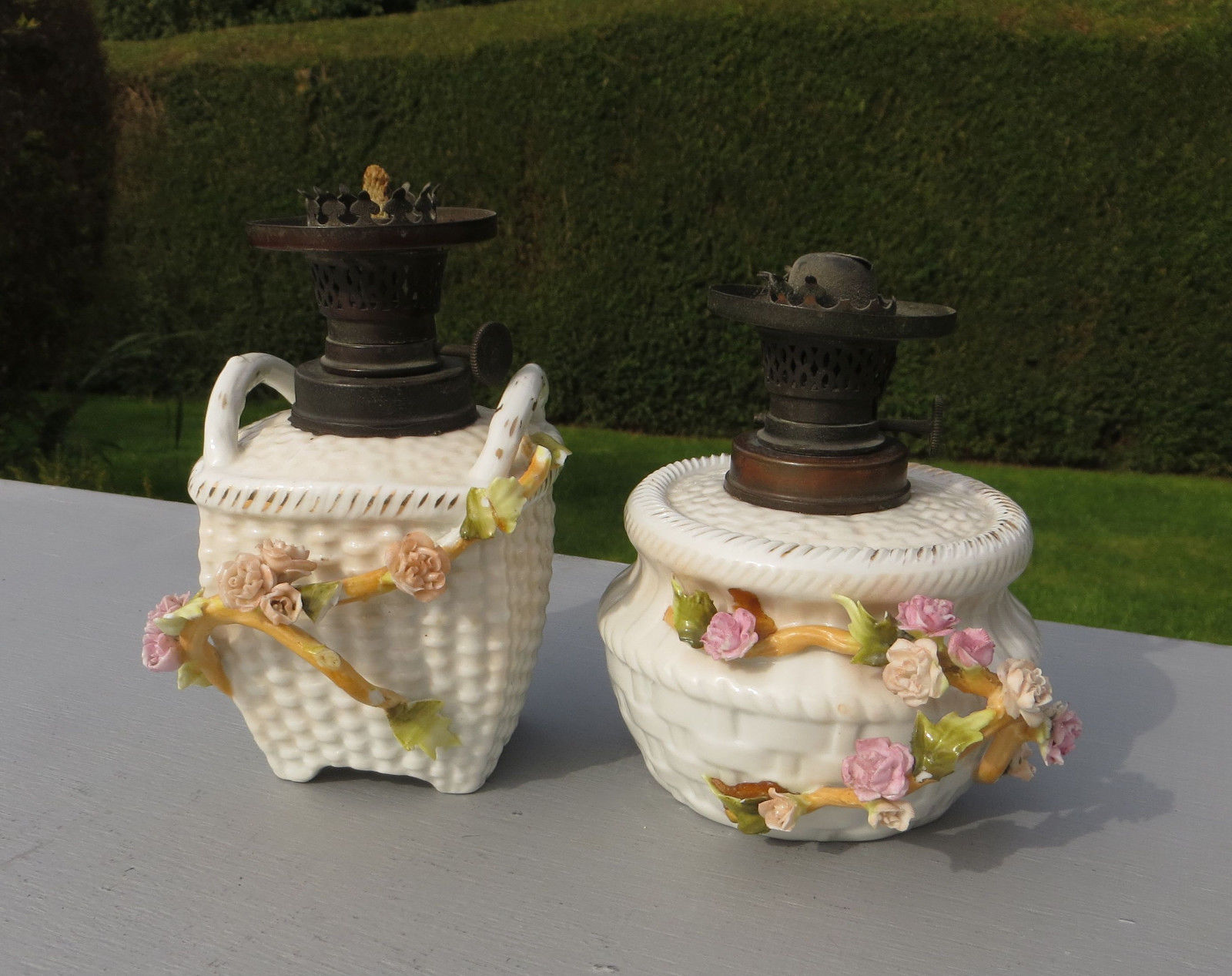 Title (ebay affiliate link): 2 Porcelain Sitzendorf Small Oil Lamps with Wild & Wessel Burners, Flowers