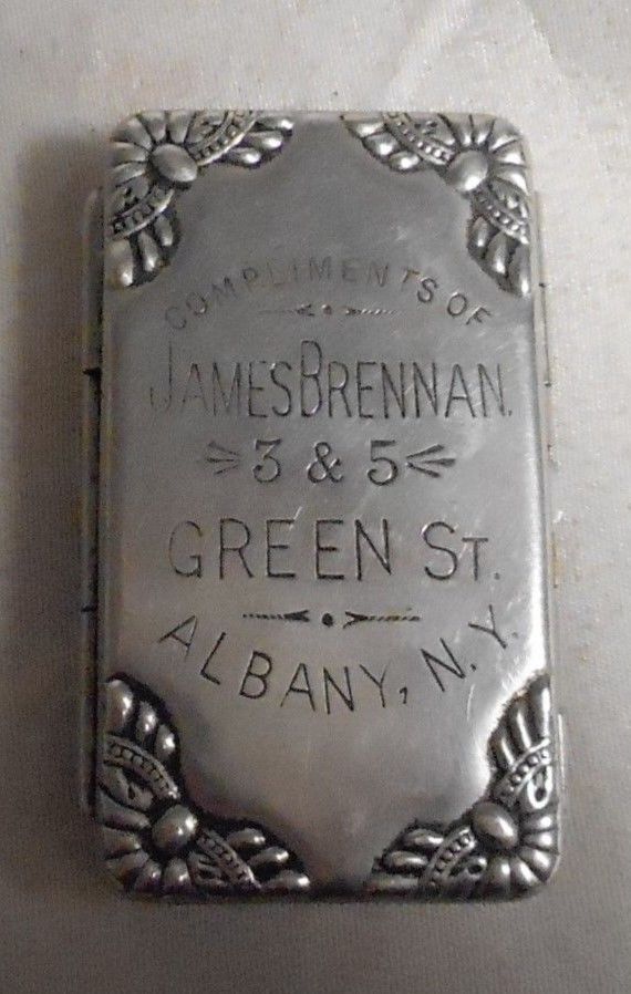 VINTAGE JAMES BRENNAN POCKET MATCH BOX SAFE, MATCH STRIKE BOTTOM ALBANY, N.Y.