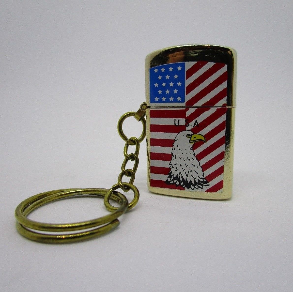 Title (ebay affiliate link): VTG Rare Mini Lighter Petrol USA Flag With Eagle Gold Keychain Keyring Unburned