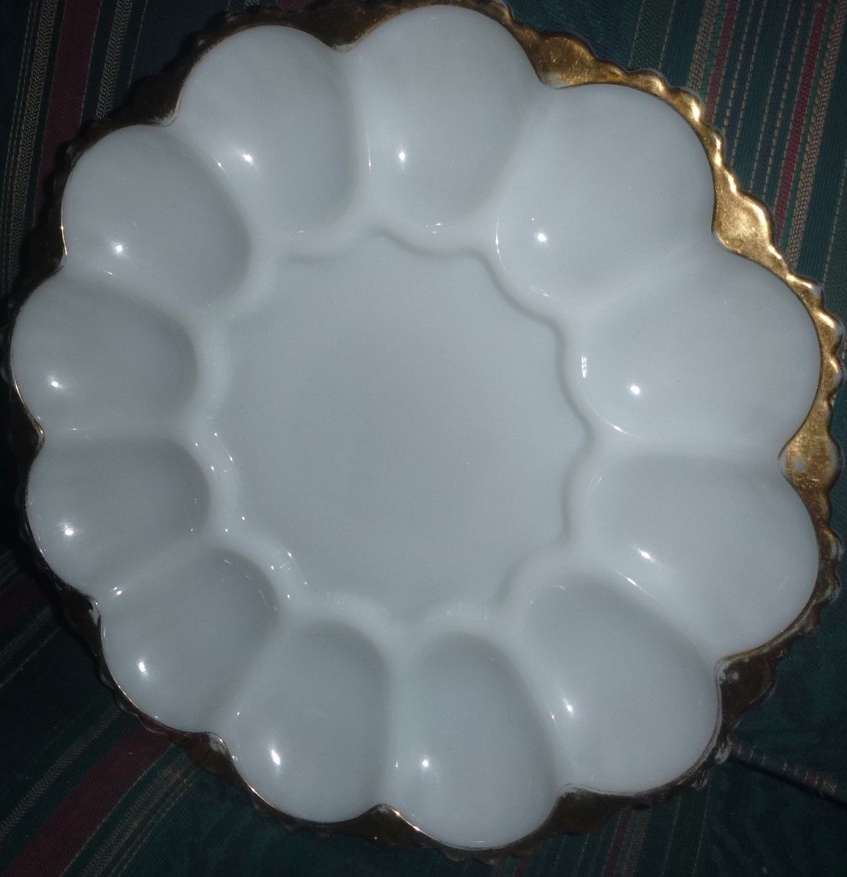 Title (ebay affiliate link): Vintage White Milk Glass Deviled Egg Oyster Dish Tray Plate Gold Scalloped Edge