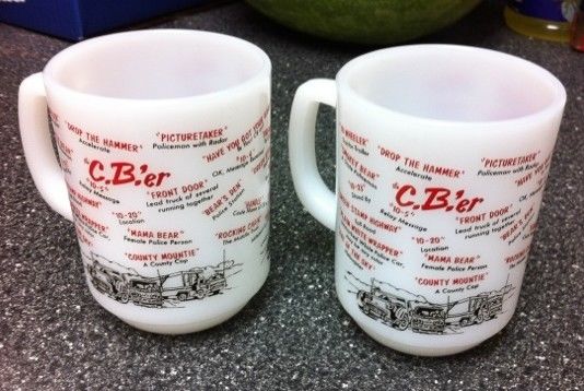 2 - Fire King Anchor Hocking CB''er Trucker Radio Milk Glass Vintage Cups
