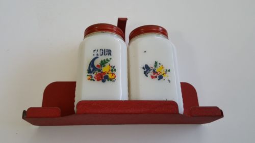 Title (ebay affiliate link): Vintage Salt and Pepper Shakers White Milk Glass & Red Lids W / RED WALL RACK