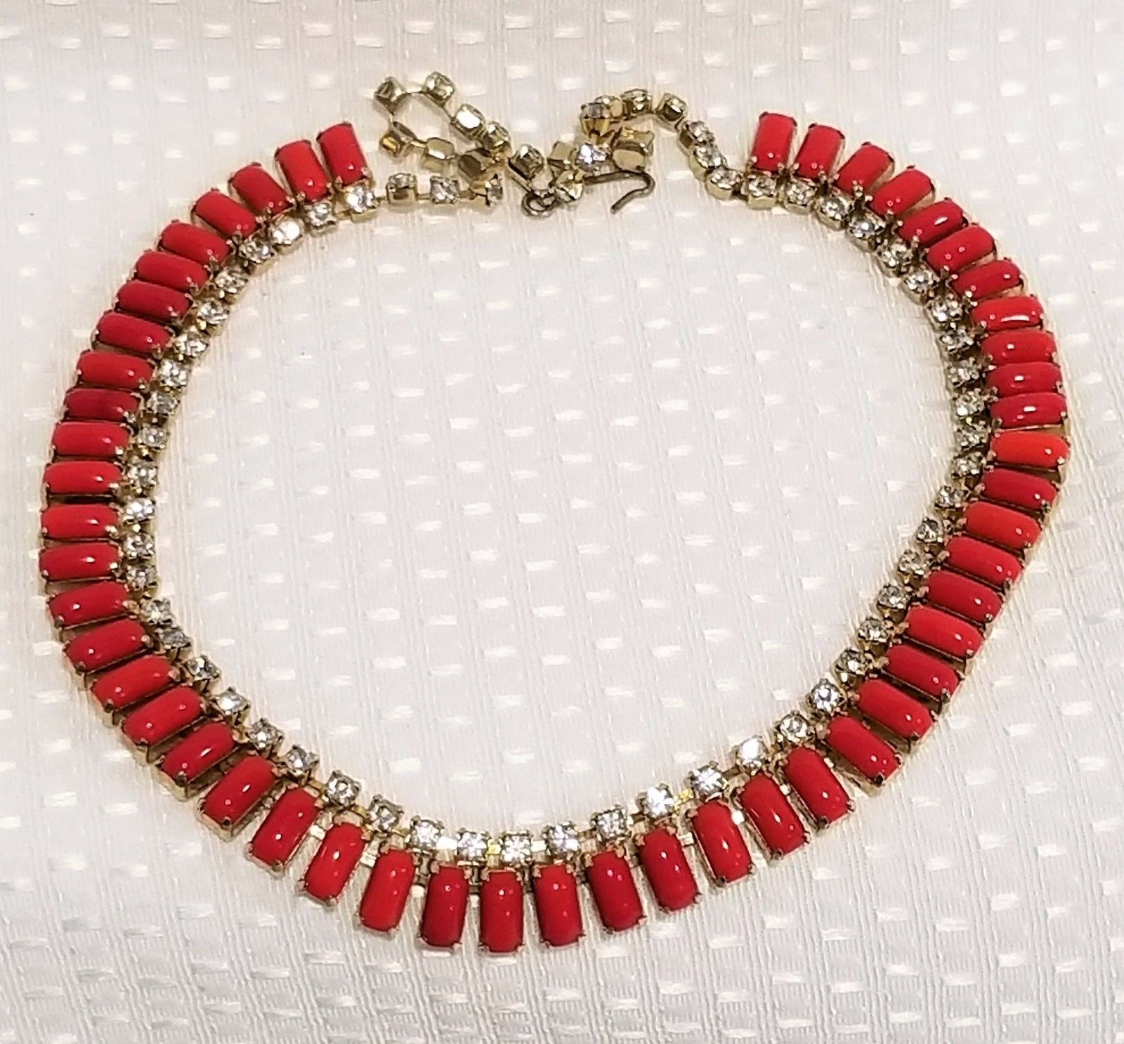 Title (ebay affiliate link): Vintage red milk glass baguette cab clear rhinestone collar necklace unsigned