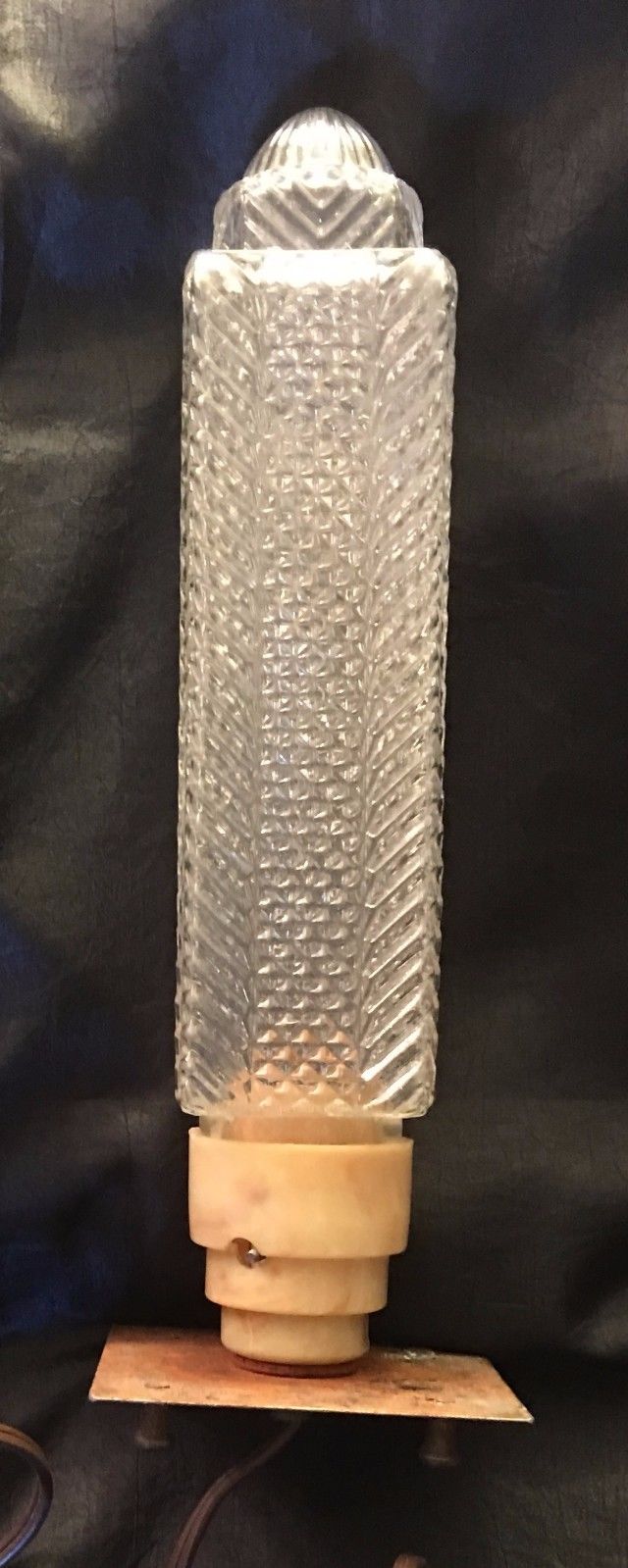 Title (ebay affiliate link): DEPRESSION ERA VINTAGE PRESSED GLASS PILLAR ART DECO BEDROOM TABLE LAMP
