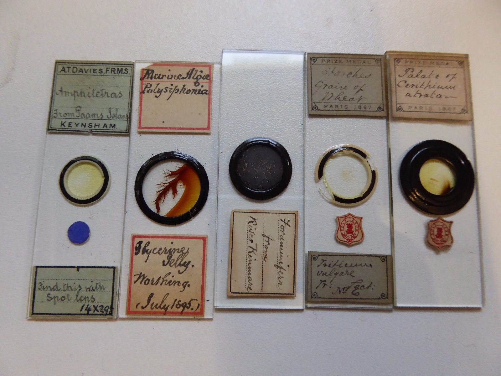 5 x Antique Glass Microscope Slides ~ Prize Medal / AT Davies Ref#1C