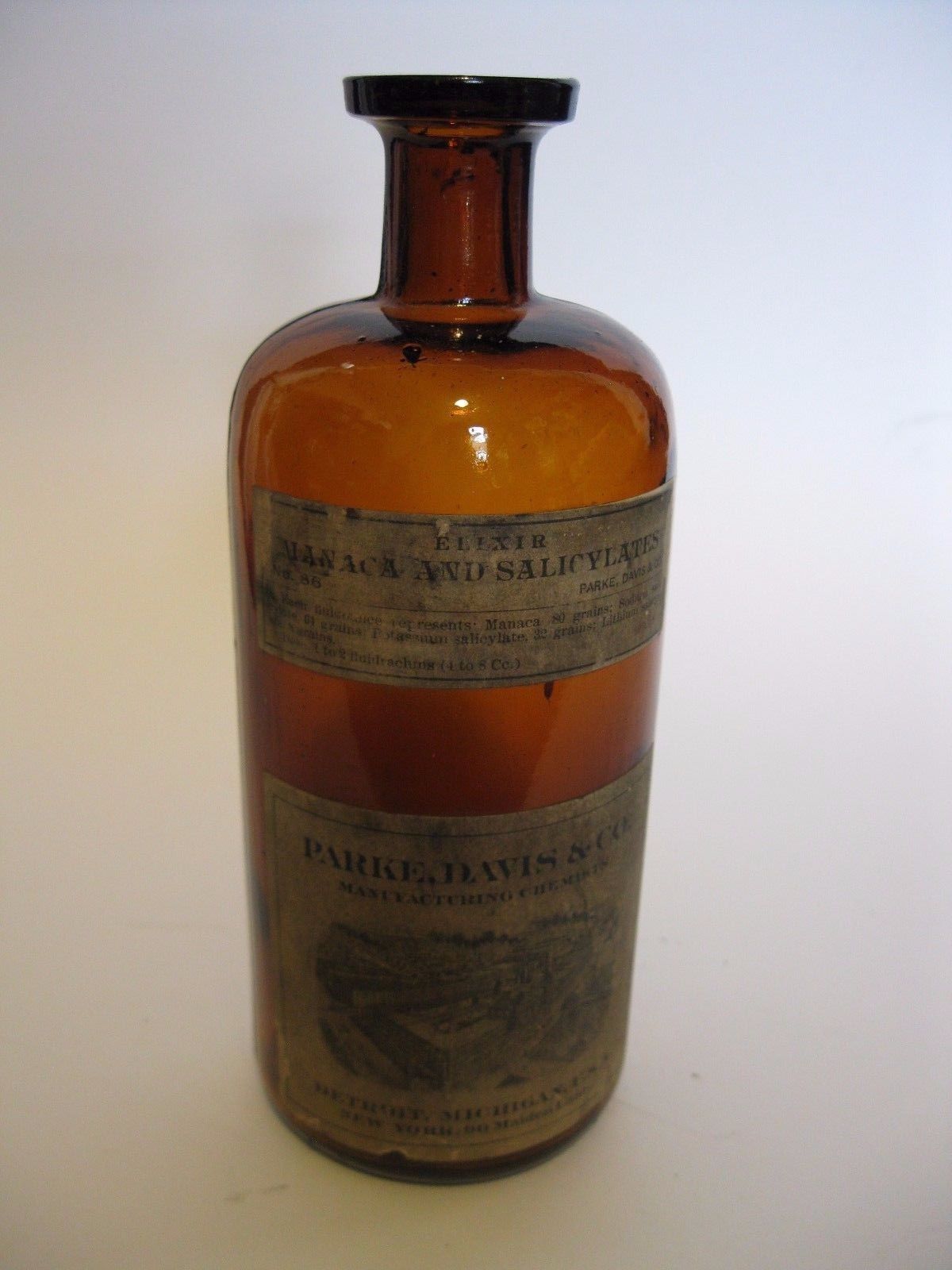 Title (ebay affiliate link): Vintage Manaca/Salicylates Parke Davis Pharmaceutical medicine drug bottle (b)