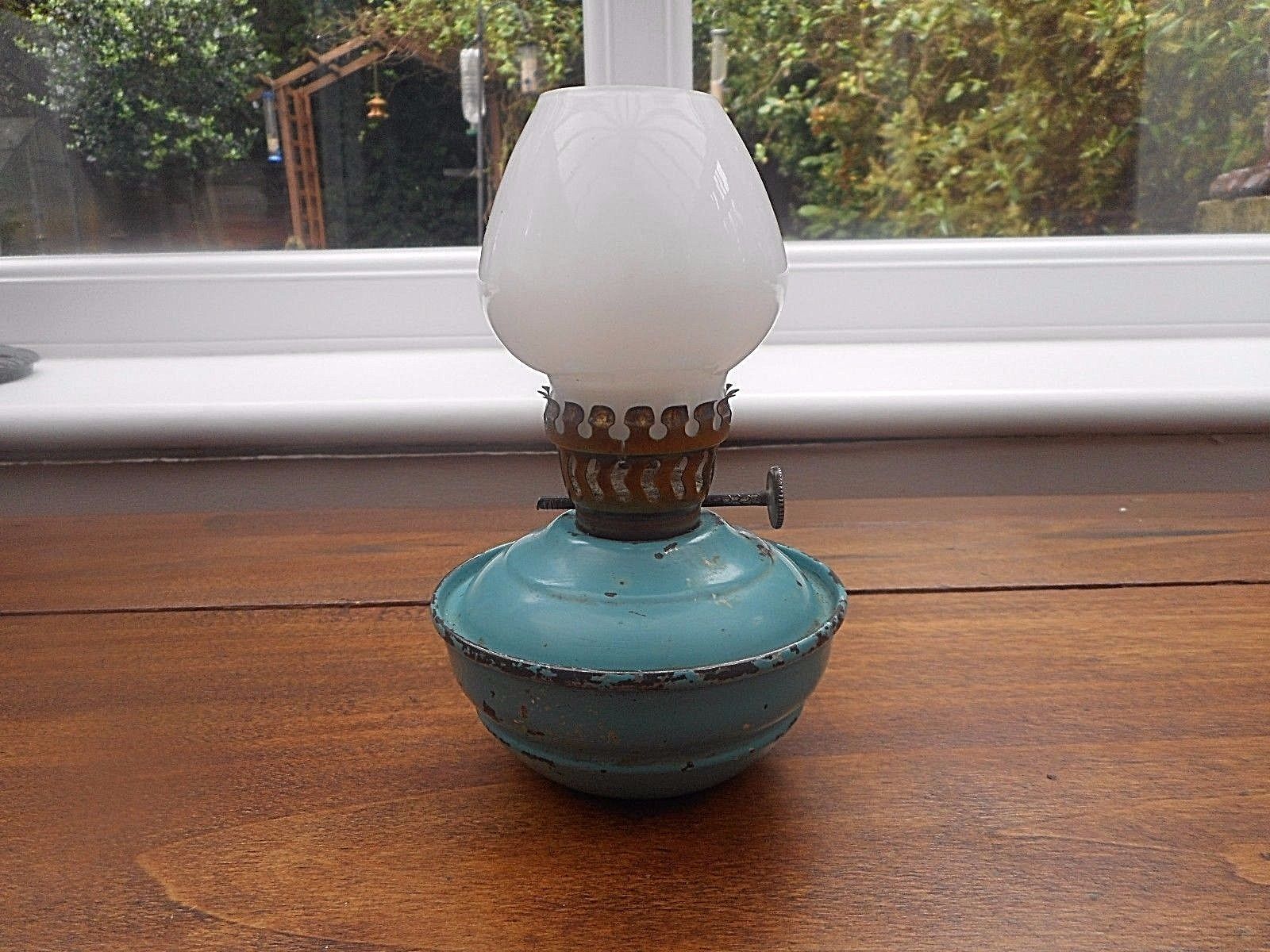 Title (ebay affiliate link): VINTAGE TURQUOISE BLUE/GREEN KELLY NURSERY OIL LAMP, OPAQUE PIXIE GLASS SHADE