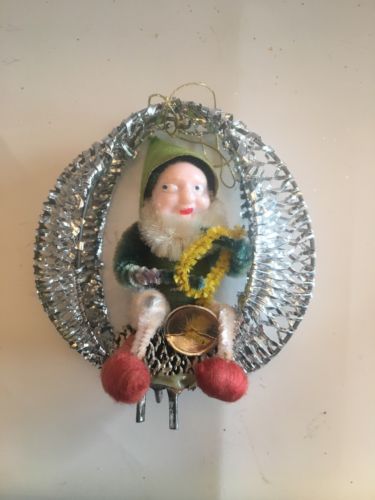 Title (ebay affiliate link): VINTAGE ELF GNOME in METAL FOIL RING CHRISTMAS ORNAMENT PINE CONE