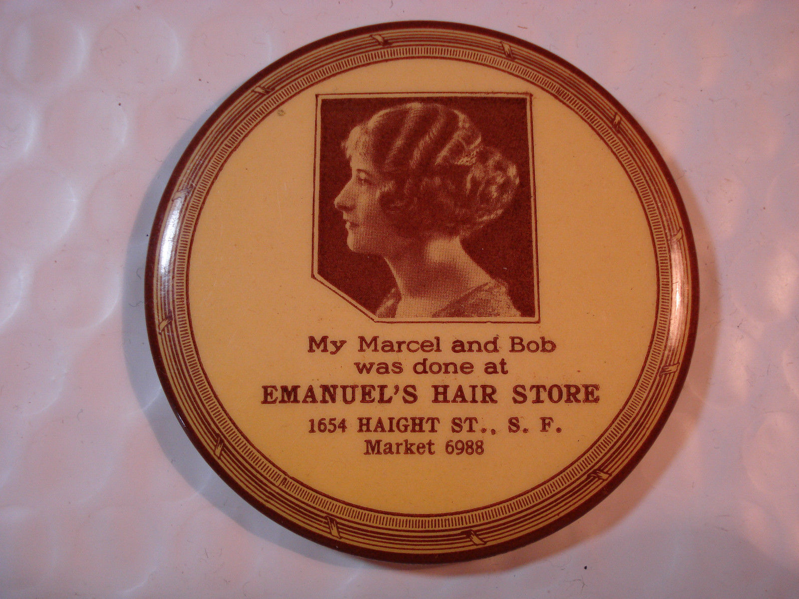 CELLULOID ADVERTISING POCKET MIRROR EMANUEL''S HAIR STORE SAN FRANCISSCO CA.