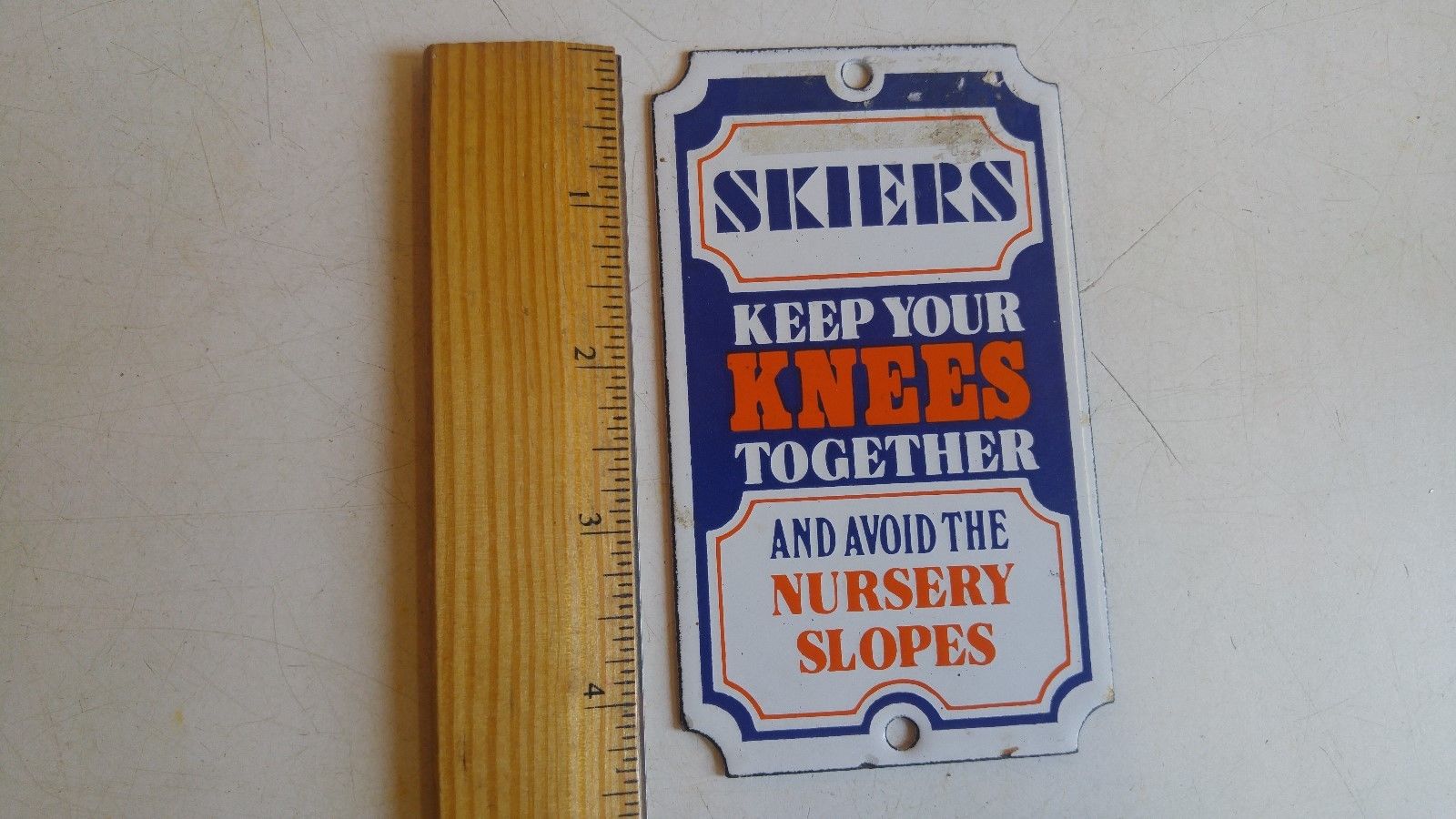 Title (ebay affiliate link): Vintage SKIERS KEEP KNEES TOGETHER Porcelain Enamel SIGN Dodo Designs SKIING