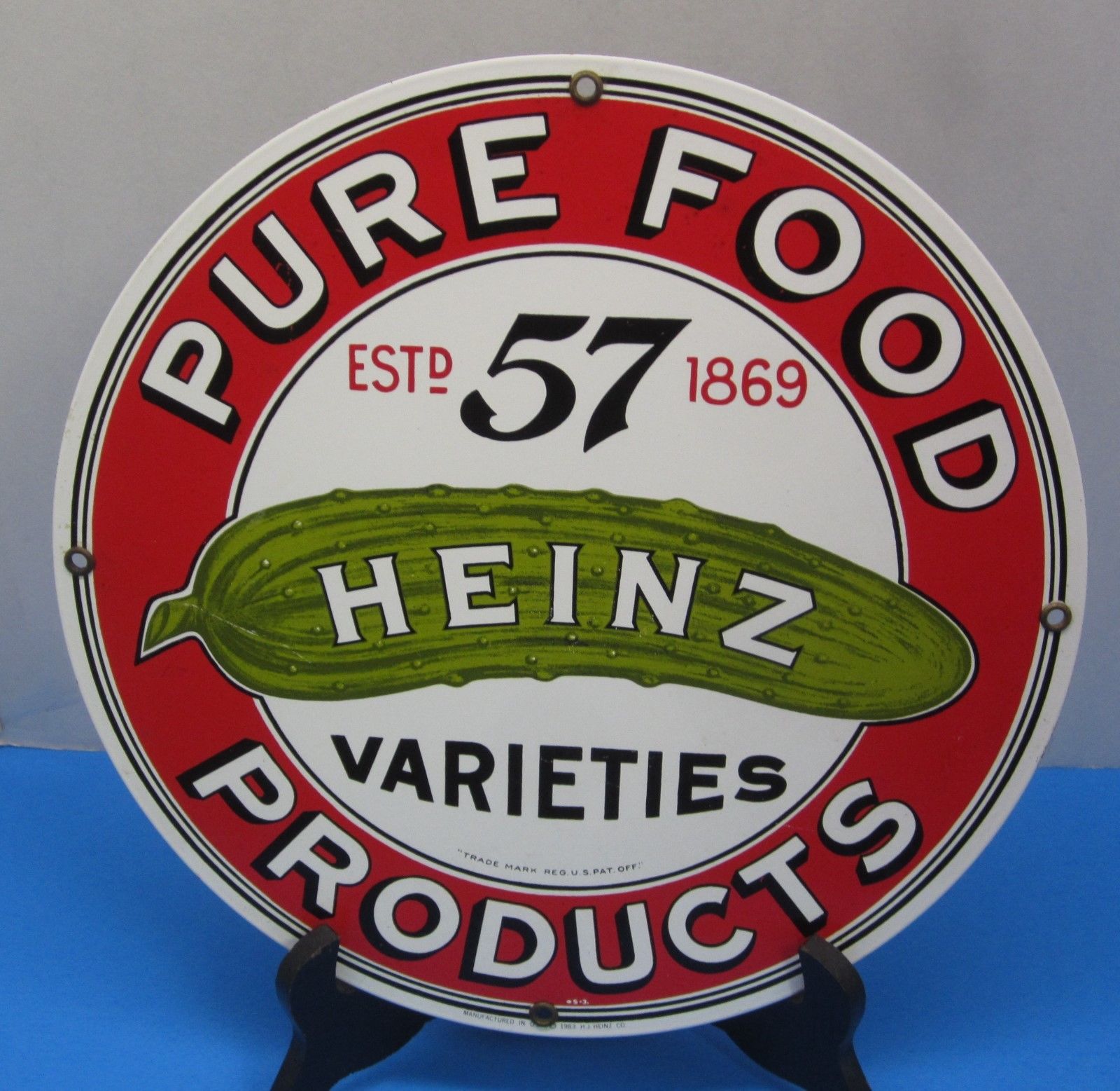 Title (ebay affiliate link): VINTAGE 1983 HEINZ PICKLES~57 VARIETY~ADVERTISING ENAMEL ROUND SIGN