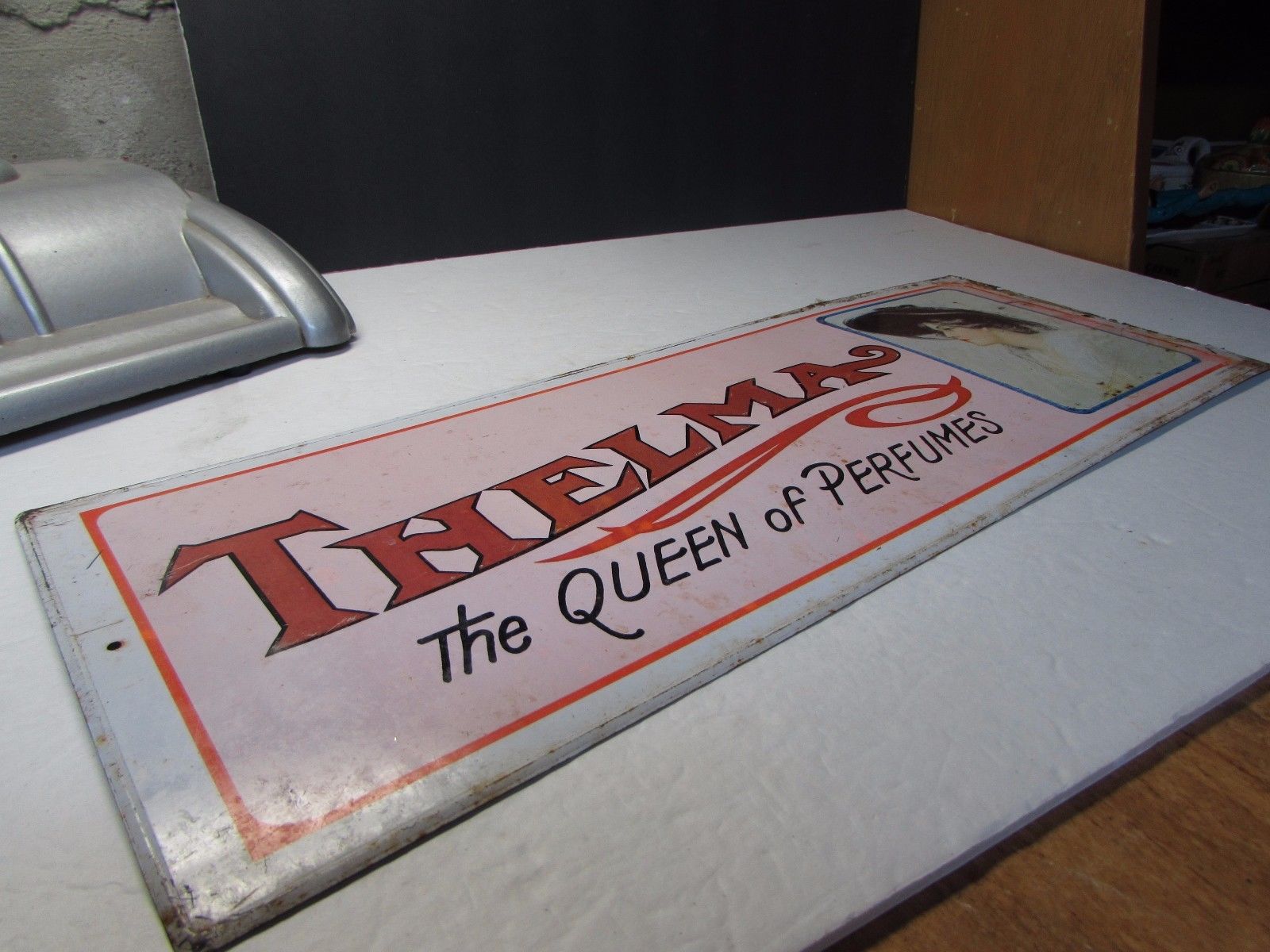 Title (ebay affiliate link): COOL VINTAGE THELMA QUEEN OF THE PERFUMES METAL ADVERTISING SIGN OVER 40 YEARS O