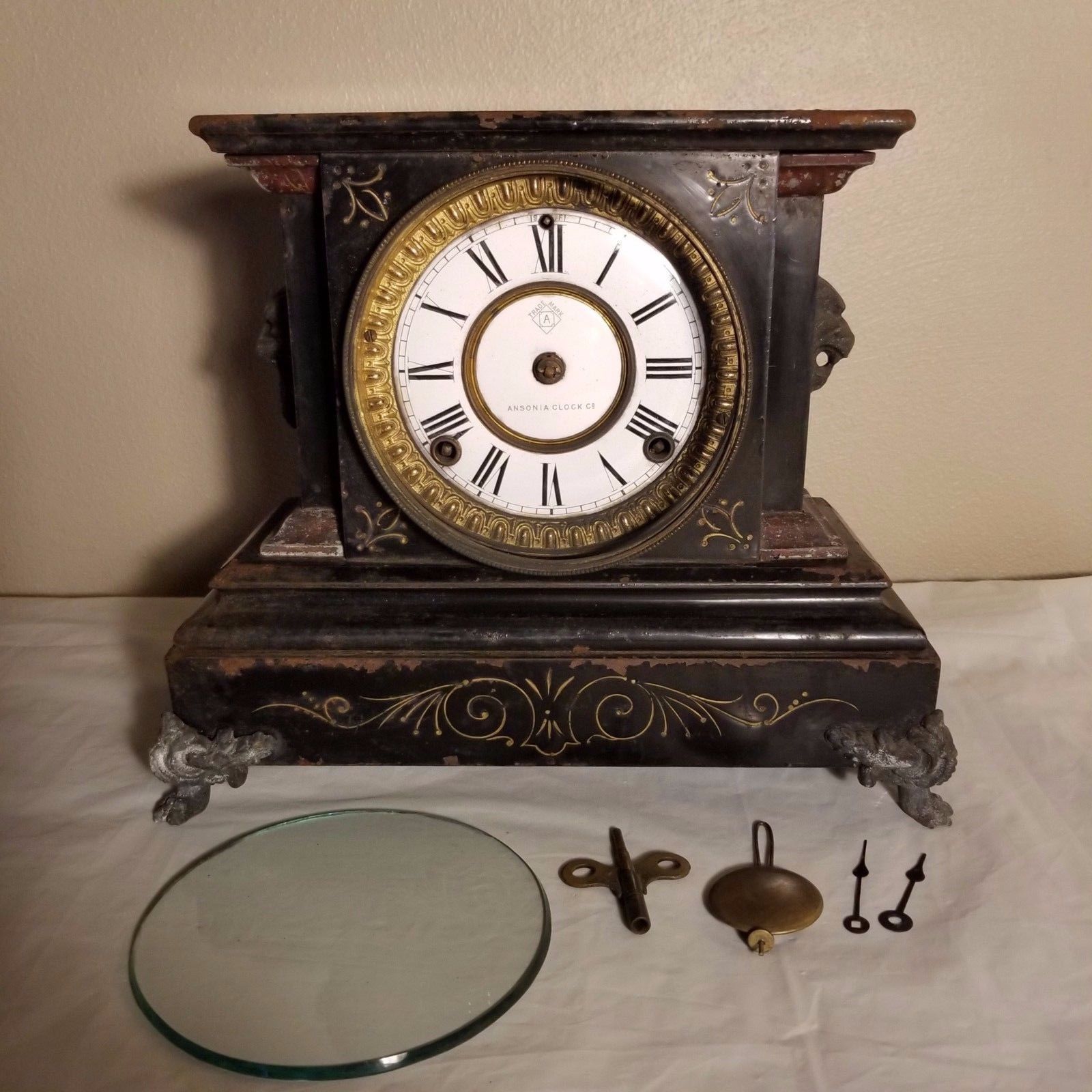 Title (ebay affiliate link): Antique Ansonia Footed Cast Iron Clock Porcelain Enamel Dial Beveled Glass