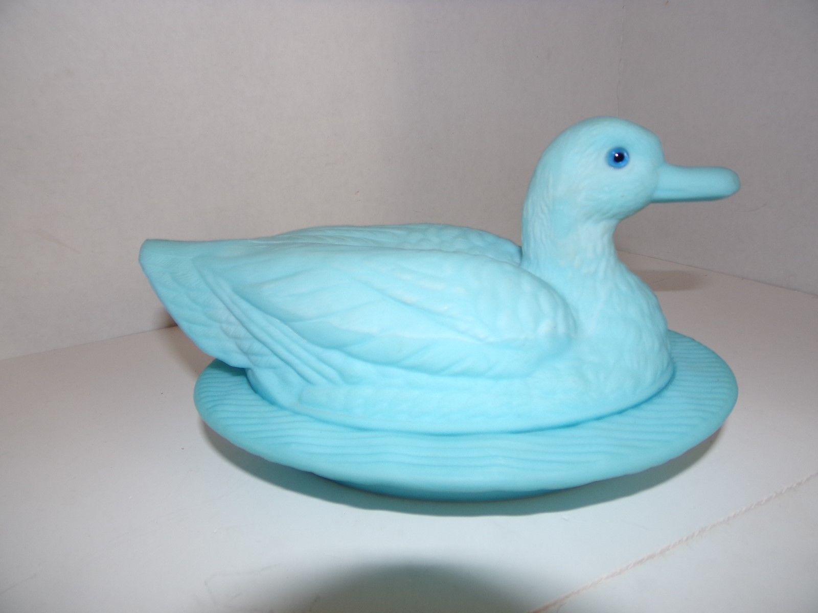 Title (ebay affiliate link): Westmoreland Covered Duck on Nest with Glass Eyes Satin Slag Blue Milk Glass