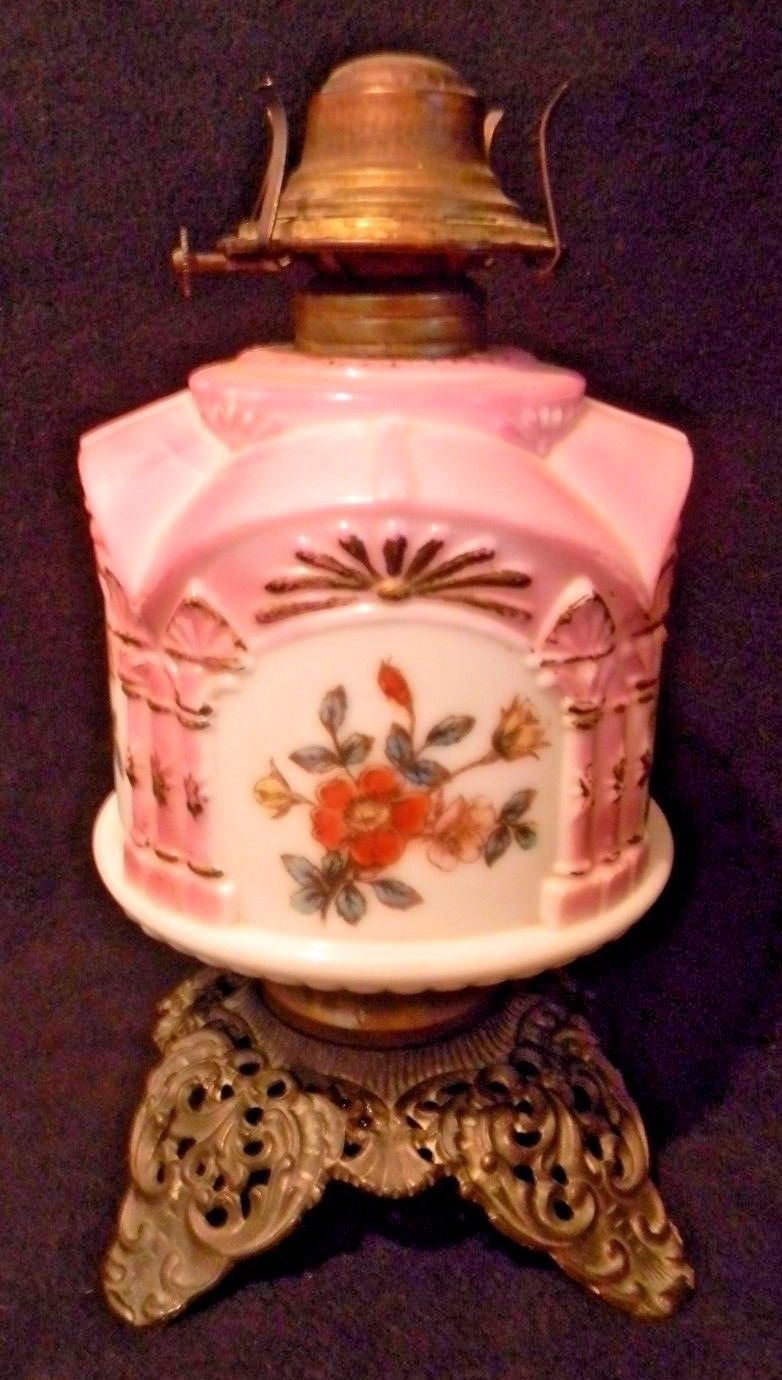 Title (ebay affiliate link): 1875+ Antique FLORAL HP Milk Glass & Metalware KEROSENE Oil LAMP BASE -- Part
