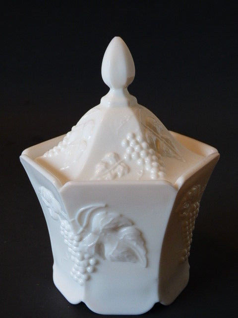 Title (ebay affiliate link): Vintage Fostoria Milk Glass Covered Candy Dish ''Vintage'' 6"
