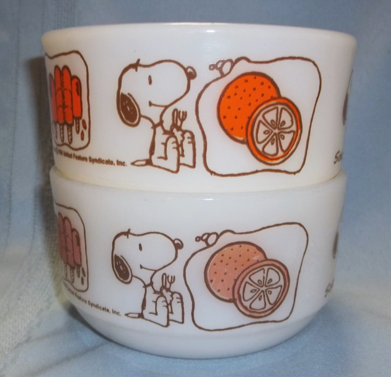 Title (ebay affiliate link): TWO (1960s?) PEANUTS/SNOOPY FIRE-KING WHITE MILK GLASS CEREAL OR ICE CREAM BOWLS