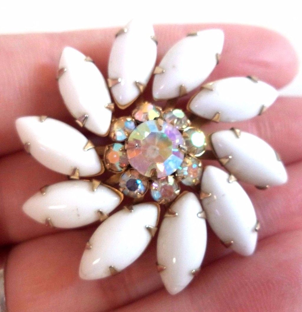 Title (ebay affiliate link): VINTAGE ESTATE HIGH END RHINESTONE MILK GLASS FLOWER 1 5/8" BROOCH!!! G6550T